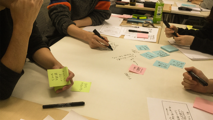 模造紙や付箋などを使って、どのチームも真剣に課題解決案のブレストを繰り返しています。